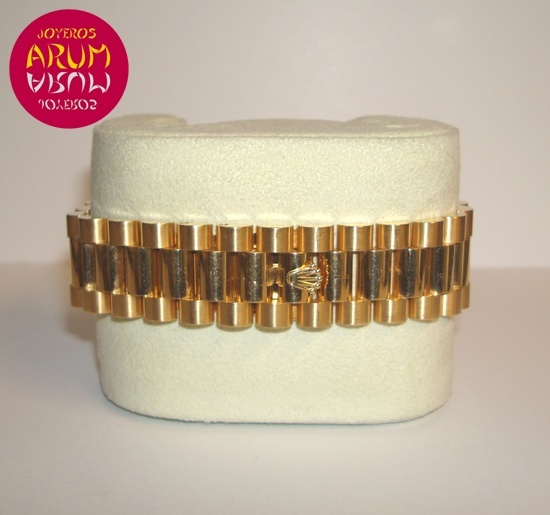 Description :yellow gold, white dial, fluted bezel, sapphire crystal, automatic movement, central second, handles and dial with luminescent indicators, date at three, magnifying glass on date, day of the week at twelve, screw crown, diameter 36 mm, waterproof 100 meters, safety ring, yellow gold president strap, hidden clasp, year 2009.