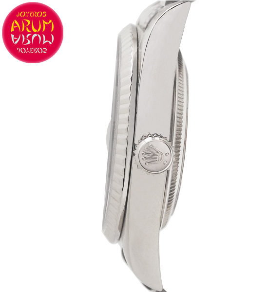 Other specifications :date at three, day at twelve, central seconds, luminous marks, safety ring with serial number, fluted bezel, screw crown.