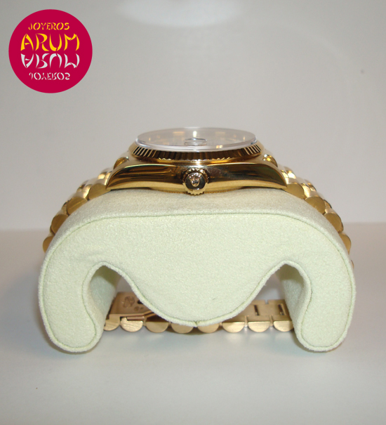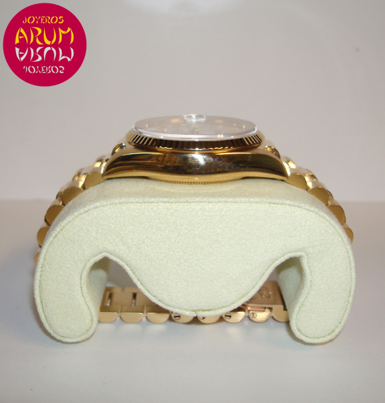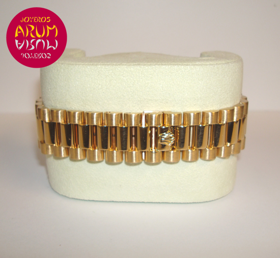 Description :yellow gold, white dial, fluted bezel, sapphire crystal, automatic movement, center seconds, luminescent handles indicators, date with magnifying glass at three, day of the week at twelve, diameter 35 mm, screw crown, yellow gold strap , hidden folding clasp in rose gold.