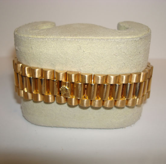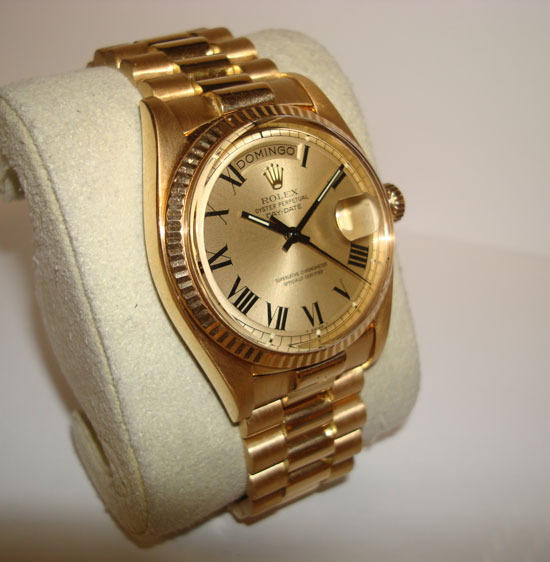 Description :pink gold, dial with roman numerals, plastic glass, fluted bezel, automatic movement, center seconds, date at three, magnifier date, day of the week, handles with luminescent indicators, screw crown, diameter 35 mm, pink gold strap, pink gold folding clasp.