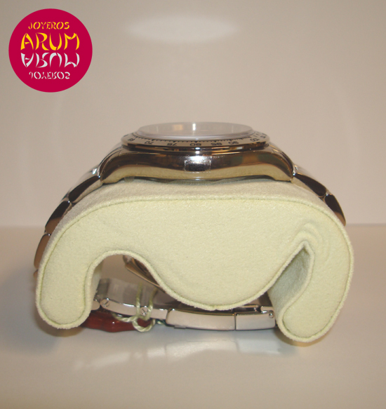Description :white gold, sapphire crystal, automatic movement, chronograph, 3 indicators on the dial, seconds, minutes, hours, luminescent handles, water resistant 100 mts. diameter 40 mm, screw crown and two buttons, white gold strap, folding clasp.