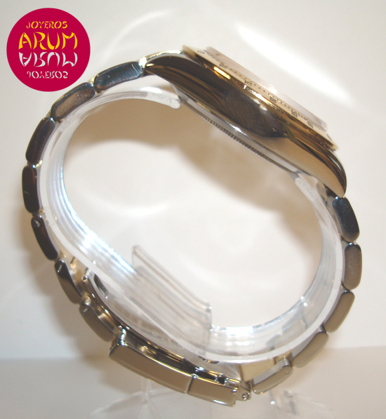 Description :steel and yellow gold, white dial, sapphire crystal, automatic movement, handles and dial with luminescent indicators, chronograph, three indicators on the dial, seconds, minutes and hours, screw crown and pushers, 40 mm diameter, 100 meters underwater, steel and yellow gold strap, folding clasp, year 2009.