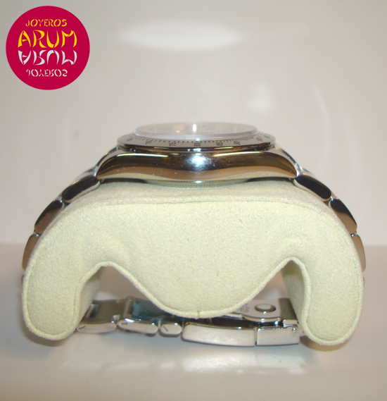 Description :steel, black dial, fixed bezel with numeric scale, sapphire crystal, automatic movement, chronograph, three indicators on the dial, seconds, minutes and hours, dial indicators and luminescent handles, screw crown, diameter 40 mm, waterproof 100 meters, steel bracelet, steel folding clasp, year 2008.