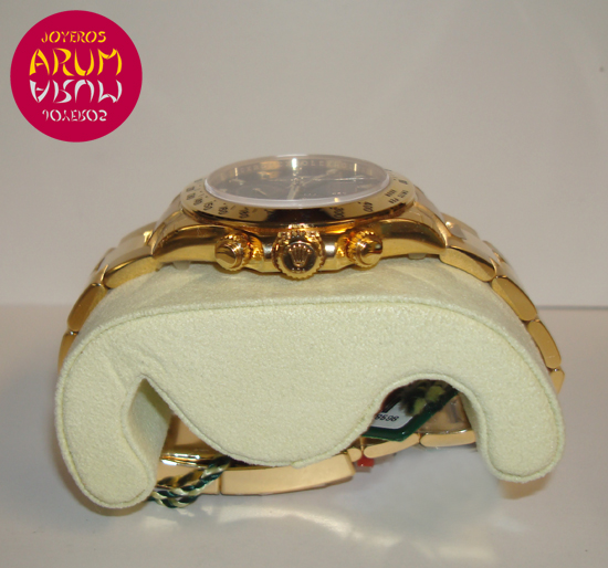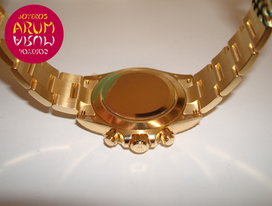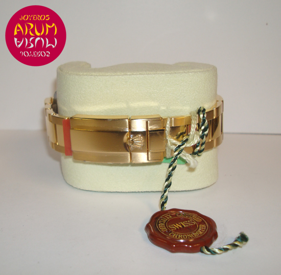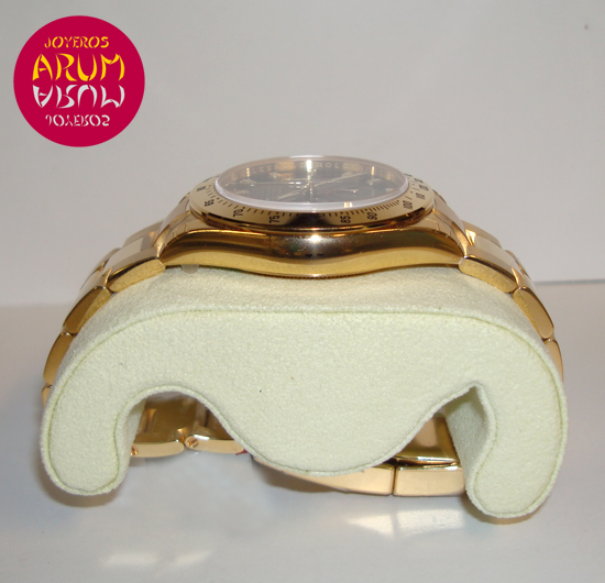 Description :yellow gold, black dial, sapphire crystal, automatic movement, handles and dial with luminescent indicators, chronograph, three indicators on the dial, seconds, minutes and hours, screw crown and pushers, 40 mm diameter, 100 meters underwater, strap yellow gold, folding clasp.