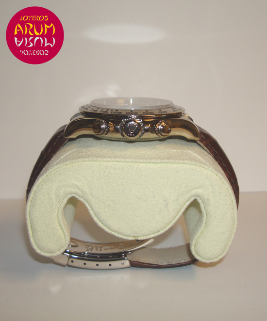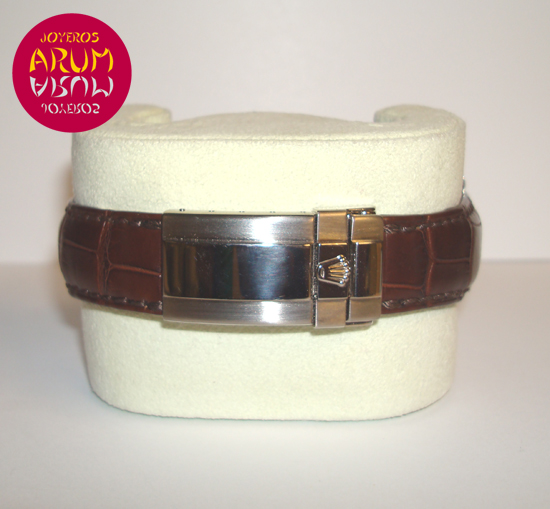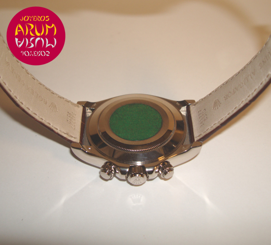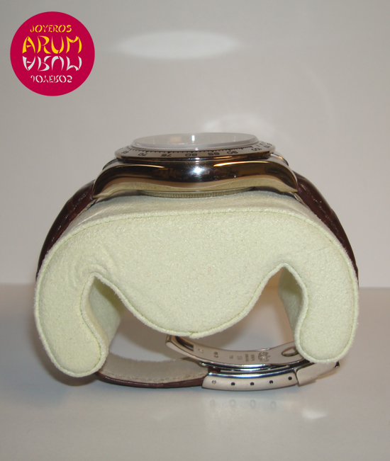 Description :white gold, white dial, sapphire crystal, automatic movement, chronograph, 3 indicators on the dial, seconds, minutes, hours, luminescent handles, water resistant 100 mts. diameter 40 mm, screw crown and two buttons, leather strap, white gold folding clasp, year 2005.