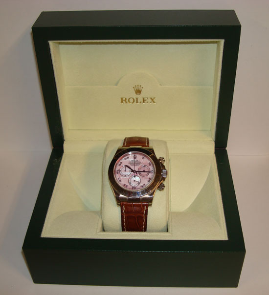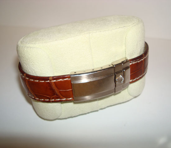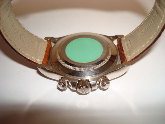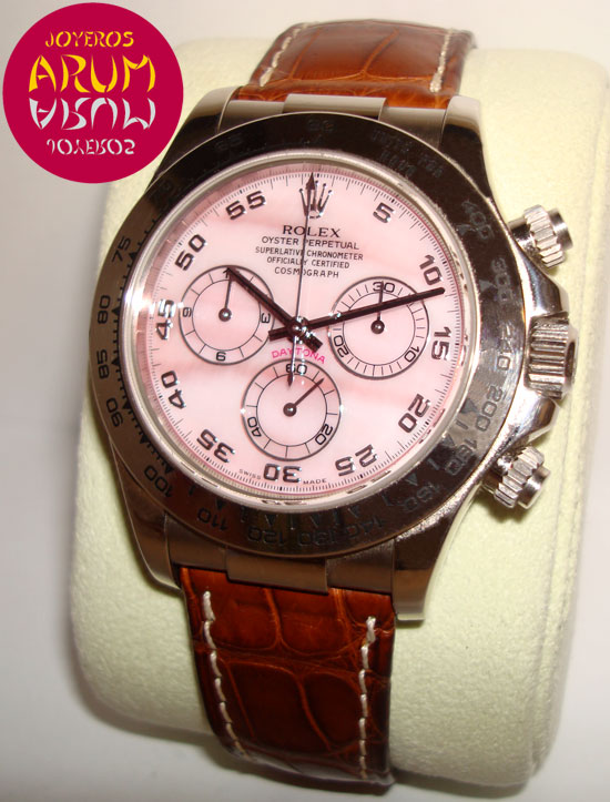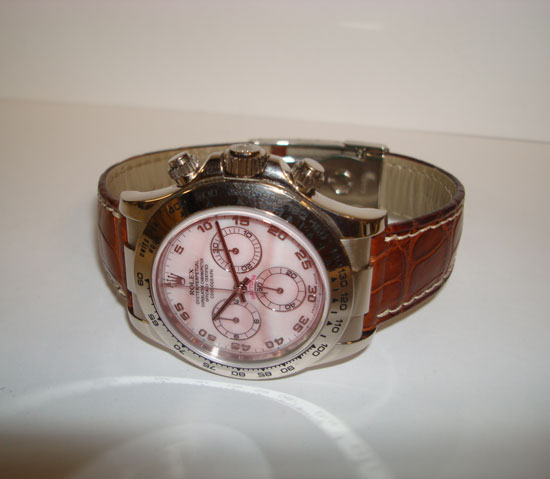 Description :white gold, sphere mother of pearl, sapphire crystal, automatic movement, chronograph, 3 indicators on the dial, screw crown and pushers, diameter 39 mm, brown leather strap, folding clasp with Rolex logo.