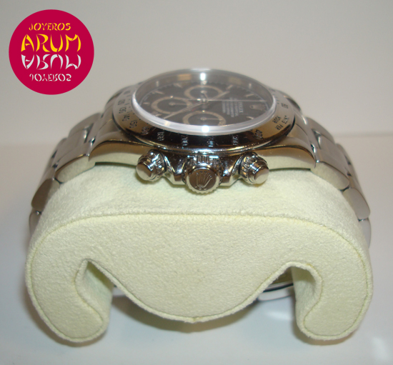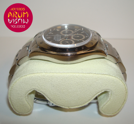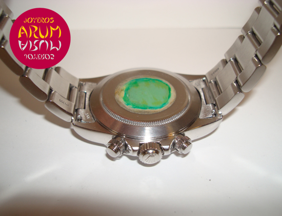 Description :steel, black dial, fixed bezel with numeric scale, sapphire crystal, automatic movement, machinery Zenith, chronograph, three indicators on the dial, seconds, minutes, hours, handles and luminescent dial, diameter 39 mm, screw crown and pushers, 100 meters waterproof, steel strap, folding clasp, series E (year 1990).
