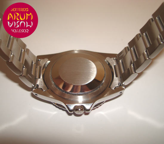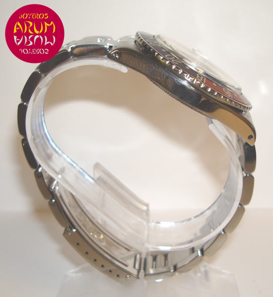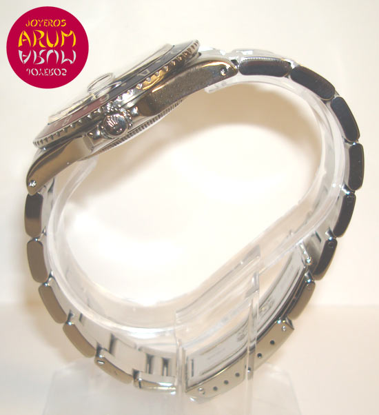 Description :steel, black dial, two tone bezel, plexi crystal, automatic movement, GMT function (auxiliary handle that indicates a second time zone), center seconds, handles and luminescent dial, date with magnifier at three, screw crown, diameter 40 mm, steel strap, steel folding clasp, year 1968.