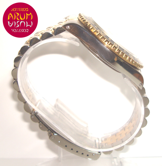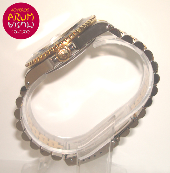 Description :steel, black dial, sapphire crystal, rotating bezel, automatic movement, GMT function, center seconds, luminescent handles and dial, date at three, screw crown, diameter 40 mm, waterproof 100 meters, steel and yellow gold bracelet, folding clasp.