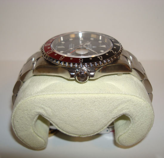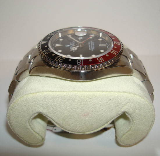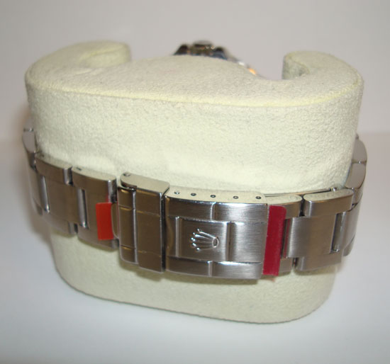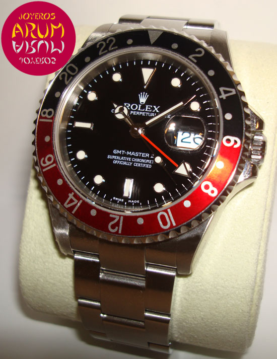 Description :steel, black dial, black and red bezel, sapphire crystal, automatic movement, central second, date at three, GMT (dual time), handles and dial luminescent, screw crown, waterproof 100 meters, diameter 40 mm, steel strap, steel folding clasp, year 2006.