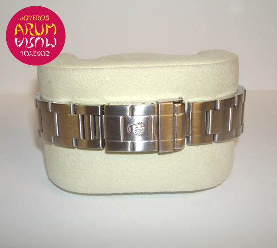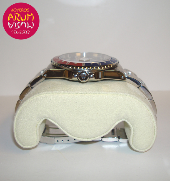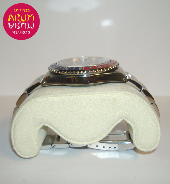Description :steel, black dial, two tone bezel, sapphire crystal, automatic movement, center seconds, luminescent indicators handles and dial, date with magnifying glass at three, GMT function (second time zone indicated by auxiliary handle), screw crown, water resistant 100 meters, steel bracelet, folding clasp in steel.