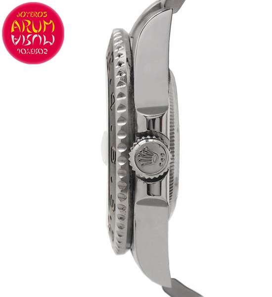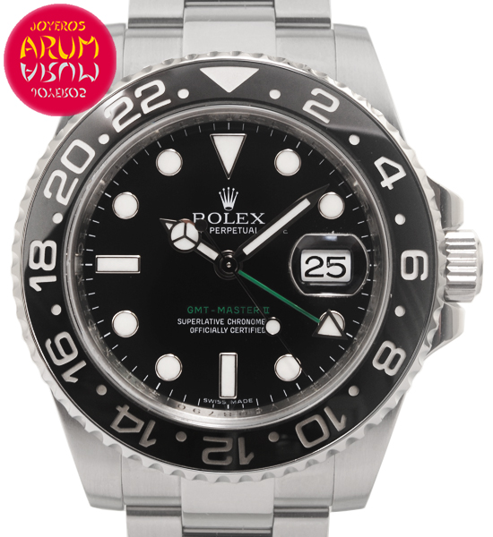 Other specifications :ceramic bezel with 24 hour scale, GMT (second time zone), date at three, central seconds, luminous handles, screw crown. Year 2010.