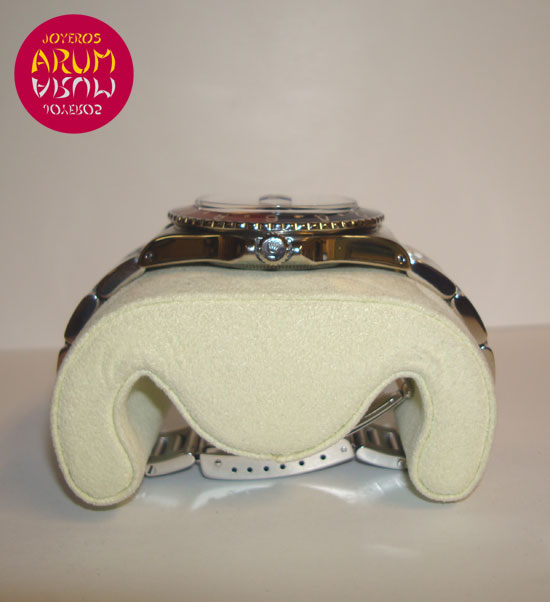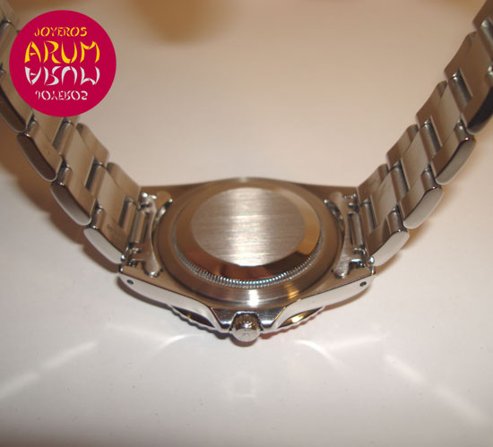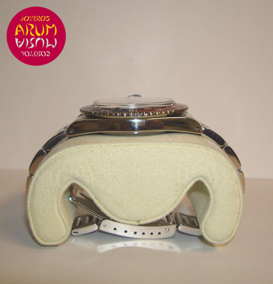 Description :steel, black dial, two tone bezel, plexi glass, automatic movement, GMT function (auxiliary handle indicates a second time zone), center seconds, luminescent handles and dial, date with magnifying glass at three, screw crown, diameter 40 mm, steel strap, steel folding clasp, year 1982.