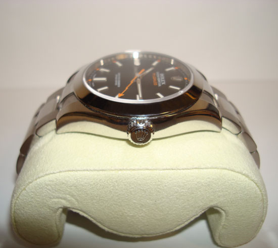 Description :steel, sapphire crystal, automatic movement, center seconds, smooth bezel, screw crown, luminescence dial and handles, diameter 40 mm, resist magnetic flux density of 1,000 gauss (0,1 Tesla), water resistant 100 mts, steel strap, folding clasp oyster.