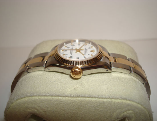 Description :ladies watch, steel and yellow gold, white dial, sapphire crystal, automatic movement, fluted bezel, center seconds, luminescent indicators handles, diameter 24 mm, screw crown, strap steel and yellow gold, folding clasp.