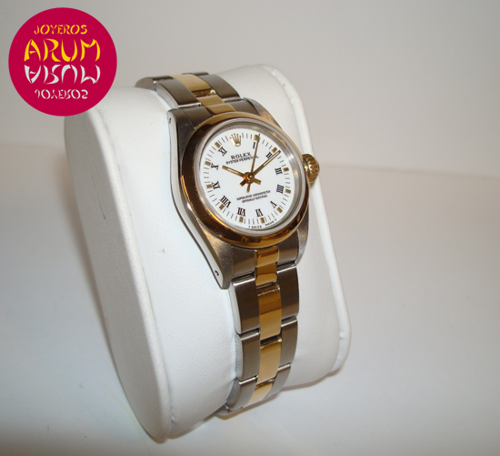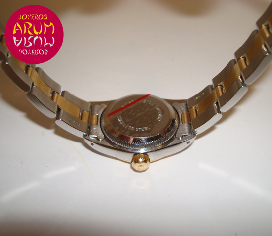 Description :lady’s watch, steel and yellow gold, white dial with roman numerals, sapphire crystal, automatic movement, center seconds, luminescent indicators handles, screw crown, diameter 23 mm, steel and yellow gold strap, folding clasp, year 1994.