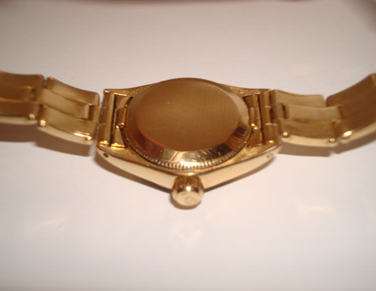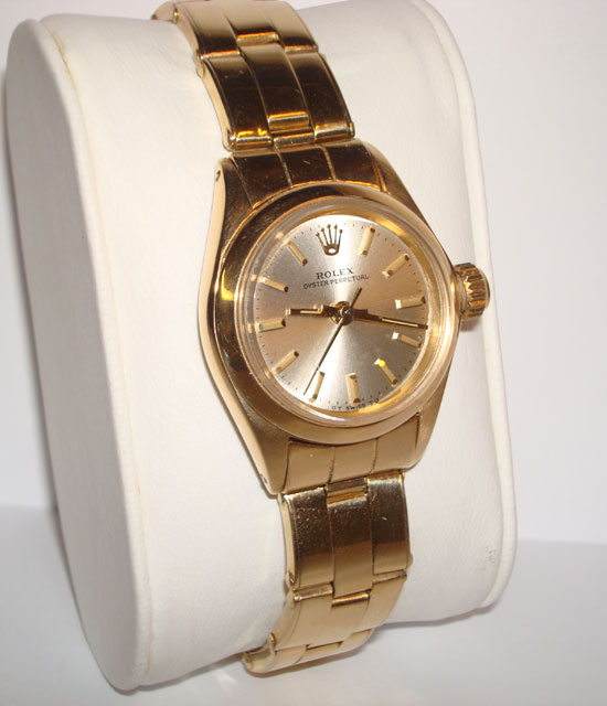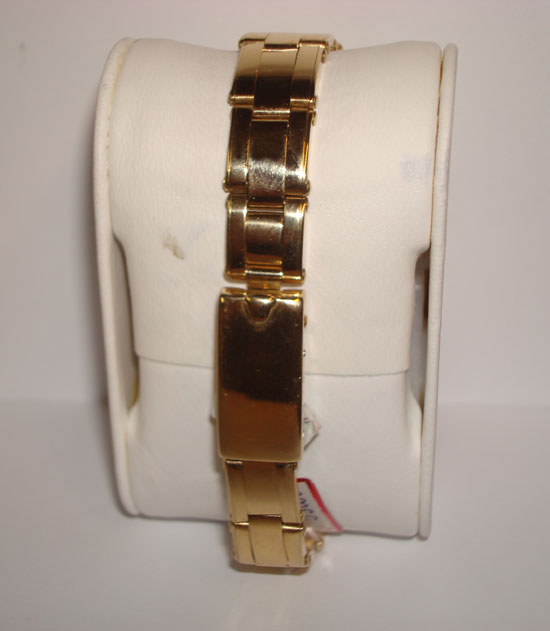 Description :Ladies watch, yellow gold, sapphire crystal, center seconds, automatic movement, 24mm diameter, luminescent hands, screw crown, elastic strap gold folding closure.