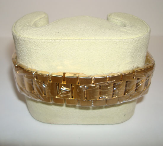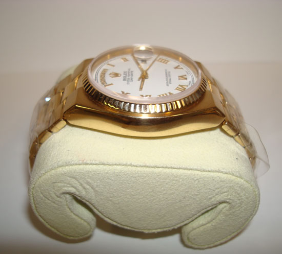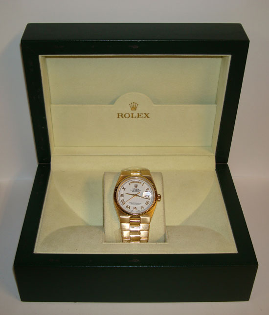 Description :yellow gold, white dial with roman numerals, sapphire crystal, quartz movement, center seconds, luminescent handles indicators, date at three, magnifying glass on date, day of the week at twelve, screw crown, diameter 35 mm, yellow gold strap, folding clasp.