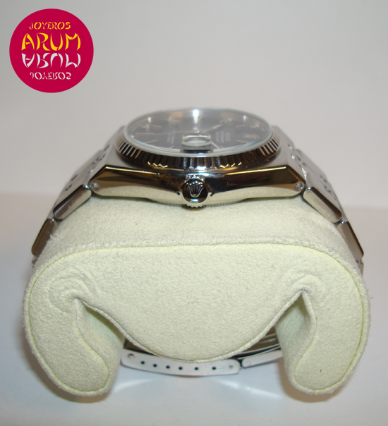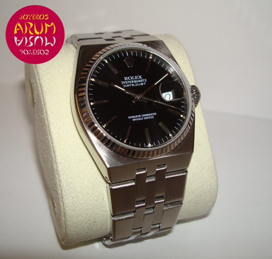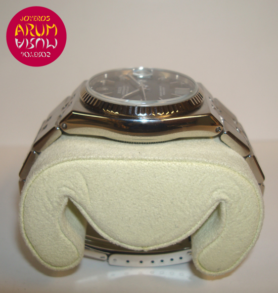 Description :steel, black dial, fluted bezel, sapphire crystal, quartz movement, central second, handles with luminescent indicators, date with magnifier at three, diameter 35 mm, steel strap, steel folding clasp, year 1986.