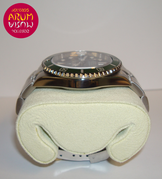 Description :steel, black dial, green rotating bezel, sapphire crystal, automatic movement, center seconds, handles and luminescent dial, date with magnifier at three, screw crown, waterproof 300 meters, diameter 40 mm, steel strap, folding clasp, year 2009.