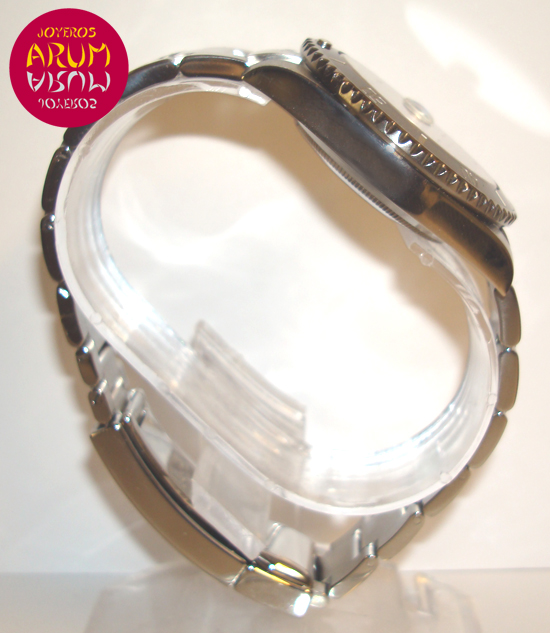 Description :steel, black dial, sapphire crystal, safety ring, automatic movement, ceramic rotating bezel, center seconds, luminescent handles and dial, date at three, screw crown, diameter 40 mm, waterproof 300 meters, steel bracelet, steel folding clasp, year 2010.