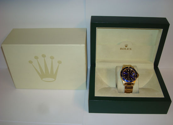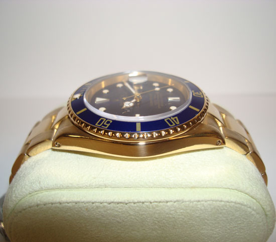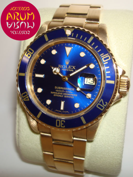 Description :yellow gold, bezel and blue dial, sapphire crystal, automatic movement, center seconds, luminescent dial and handles, date, magnifier date, waterproof 300 meters, diameter 40 mm, screw crown, yellow gold strap, folding clasp oyster.