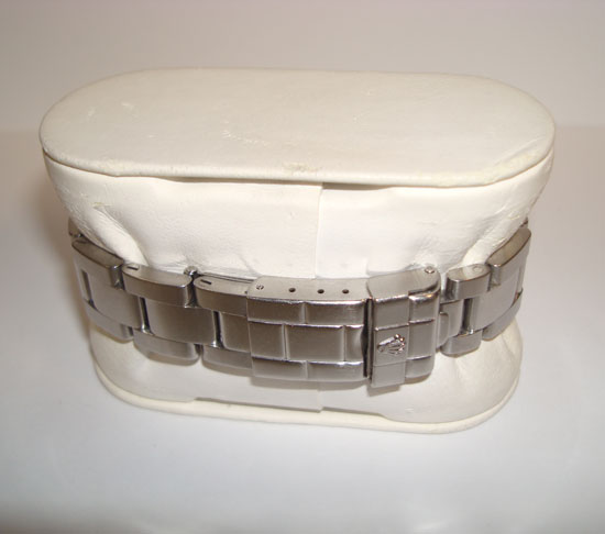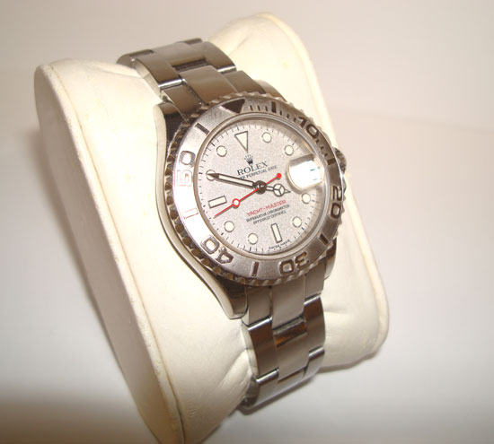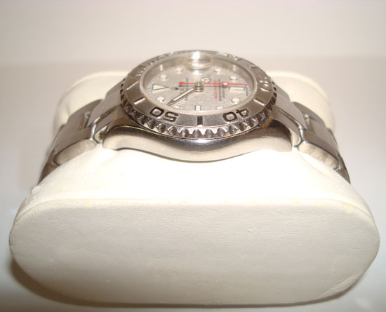 Description :lady’s watch, steel, bidirectional rotating platinum bezel with numeric scale, sapphire crystal, automatic movement, central second, handles and luminescent dial, date at three, magnifier date, screw crown, diameter 28 mm, steel strap , folding clasp oyster.