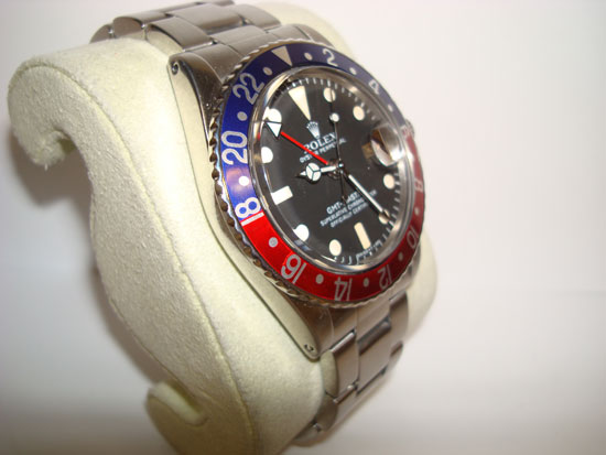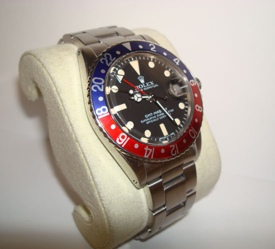 Description :steel, plastic glass, automatic movement, black sphere, luminescent in dial and handles, GMT, diameter 38 mm, steel strap, steel folding clasp.