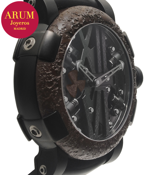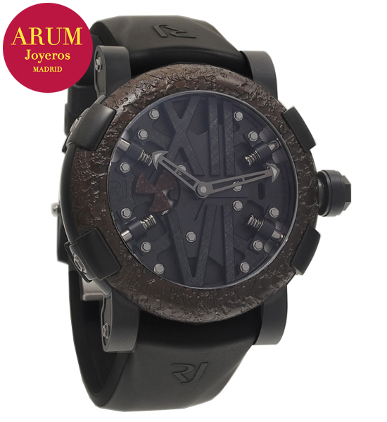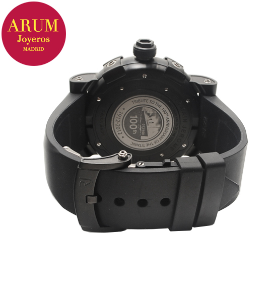 Other specifications :special edition tribute to 100th Anniversary of Titanic, limited edition 100 pieces (013/100), calibre RJ001AS, power reserve 42 hours, PVD/DLC steel, rusted steel from the Titanic in the bezel, small seconds subdial with “ship’s propeller” in rusted, luminous handles small marks, caseback engraved with 100th anniversary emblem. Year 2012.