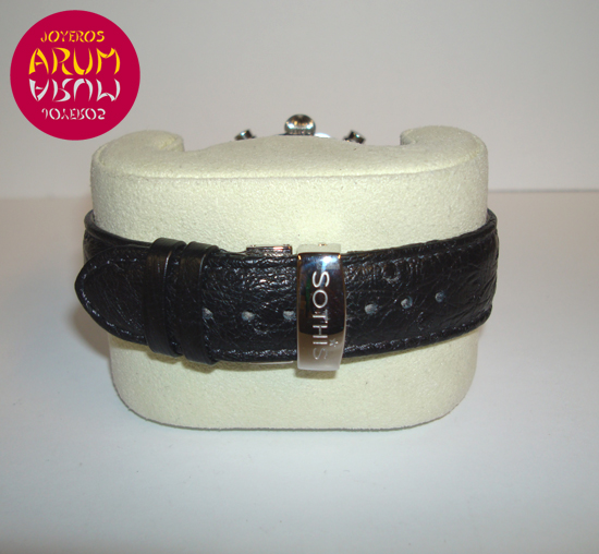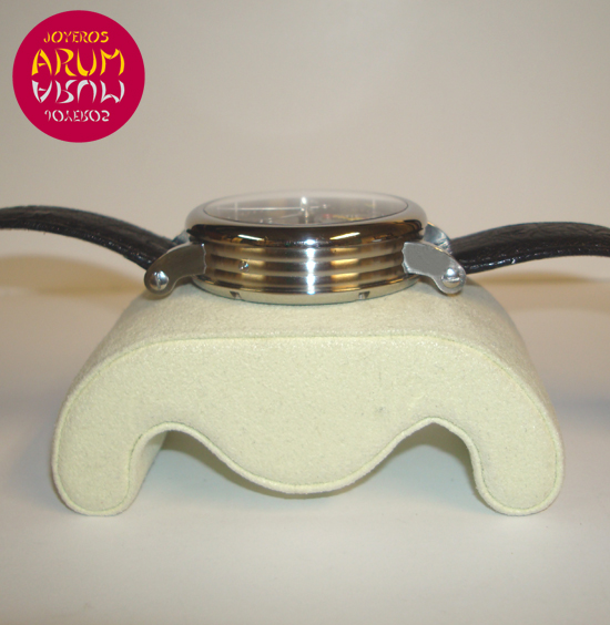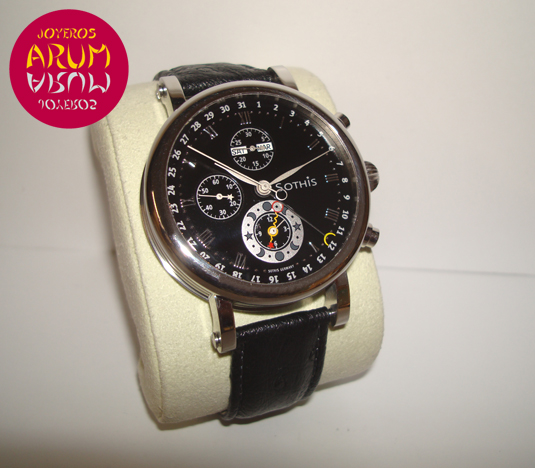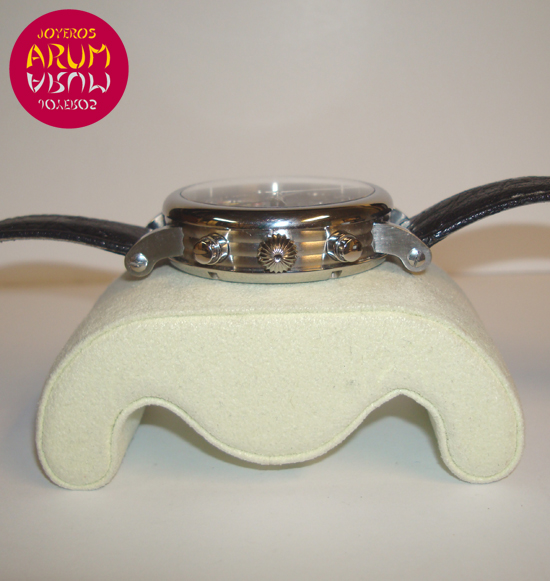 Description :limited to 500 pieces, steel, black dial, sapphire crystal, automatic movement, chronograph, three indicators on the dial, small seconds at nine. minutes and hours, auxiliary handle date indicator, day of week and month at twelve, moon phase indicator at six, transparent caseback, diameter 43 mm, waterproof 50 meters, black leather strap, folding clasp in steel.