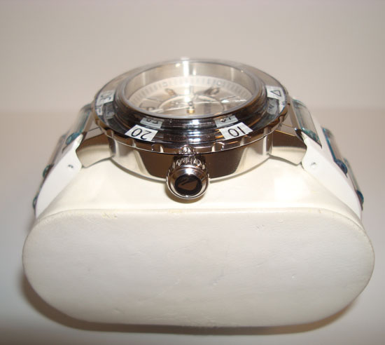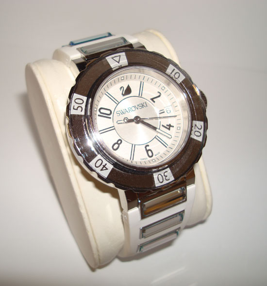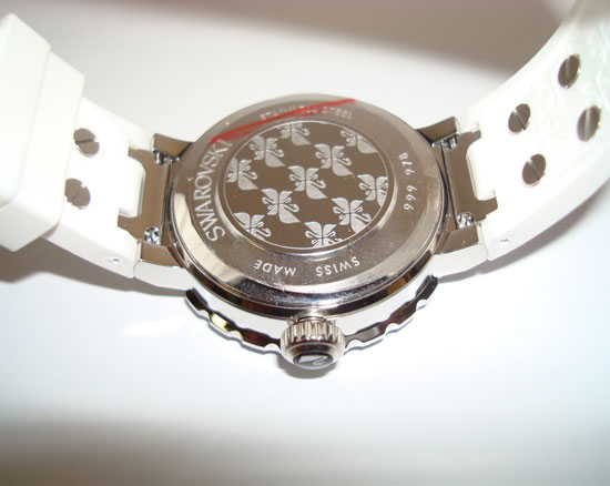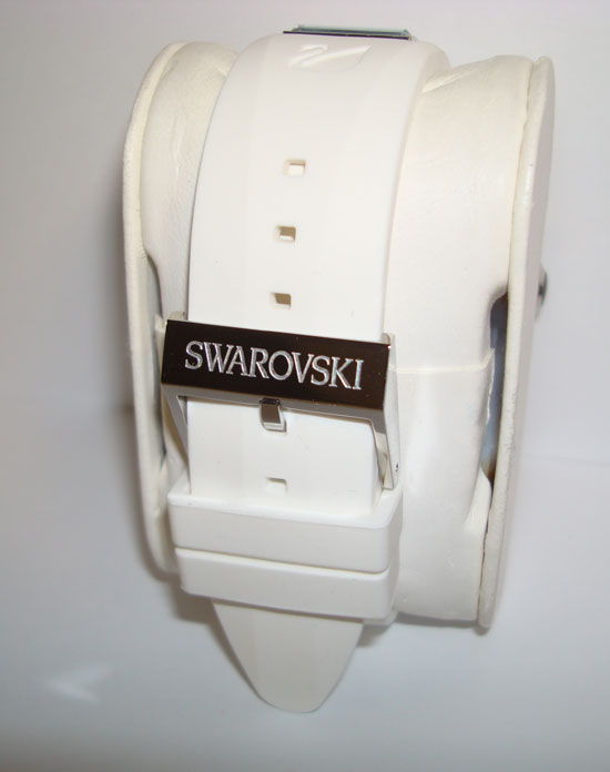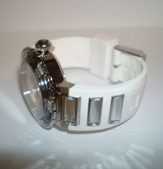 Description :steel, white dial, bezel with glass, quartz movement, central second, date at three, handles with luminescent indicators, screwed crown, diameter 39 mm, rubber strap white crystals, steel buckle closure.