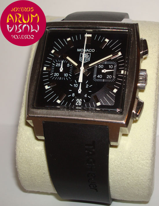 Description :steel, plastic glass, automatic movement, chronograph, date at six, luminescent hands, crowns and two removable buttons, 38 mm diameter, 30 meters underwater, black leather strap, folding steel closure with Tag Heuer logo.