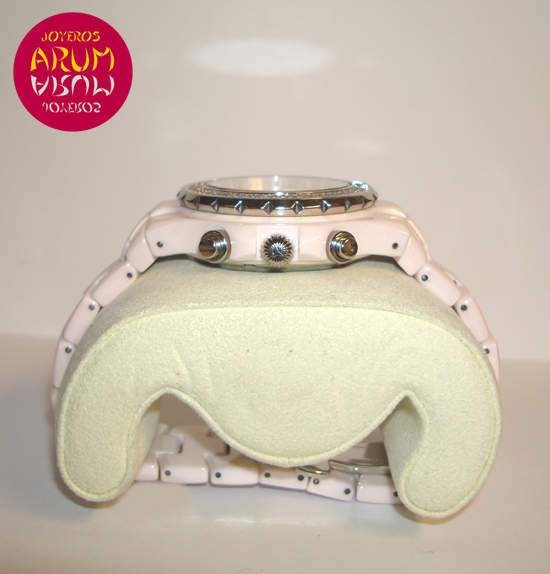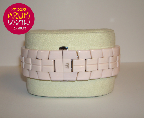 Description :ceramic, silver dial with arabic numbers, sapphire crystal, bezel with diamonds, quartz movement, chronograph, three indicators on the dial, seconds, minutes, hours, date between four and five, luminescent handles, crown clockwise and two buttons, waterproof 200 meters, diameter 39 mm, pink ceramic strap, hidden folding clasp, year 2005.