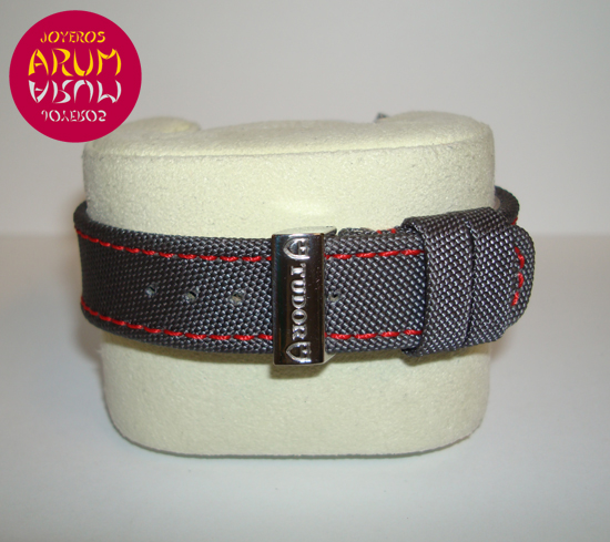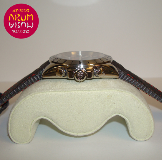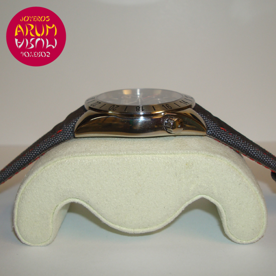 Description :steel, blue dial, fixed bezel with 24 hours numerical scale, sapphire crystal, automatic movement, GMT function (second time zone), date at six, handles and luminescent dial, waterproof 150 meters, screw crown and three buttons at the right, left auxiliary button, diameter 40 mm, textile strap, folding clasp in steel, year 2010.