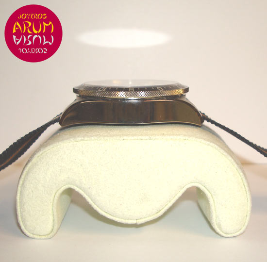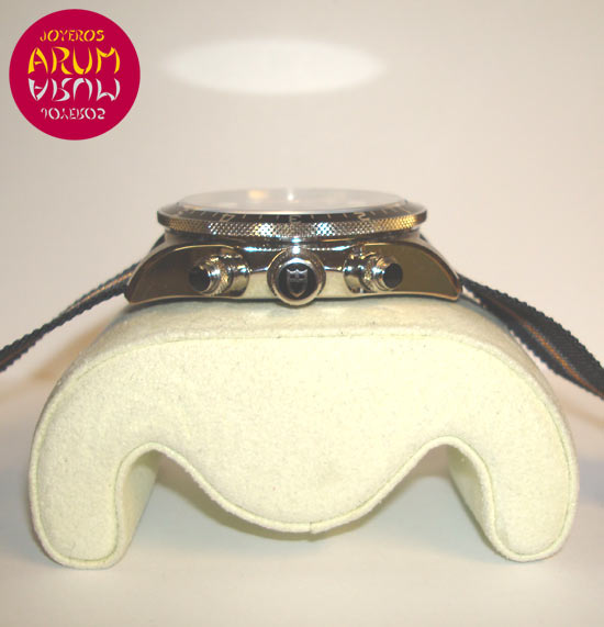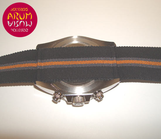 Description :steel, black dial, bidirectional rotating bezel, sapphire crystal, automatic movement, chronograph, small second at three, date at six, handles and dial with luminescent indicators, screw crown and two buttons, diameter 42 mm, waterproof 150 meters, textile strap, buckle closure, includes a second steel strap, year 2010.