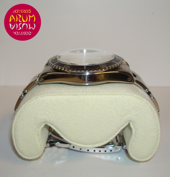 Description :steel, rotating bezel, black dial with dial indicators in yellow, plastic glass, automatic movement, center seconds, screw crown, diameter 40 mm, 200 mts waterproof, elastic strap, steel folding clasp, 60´s.