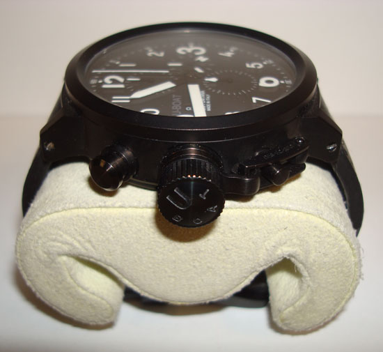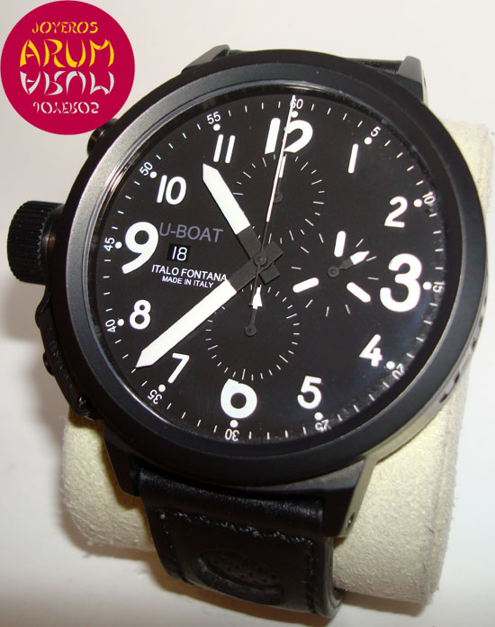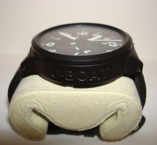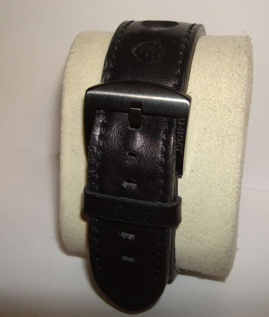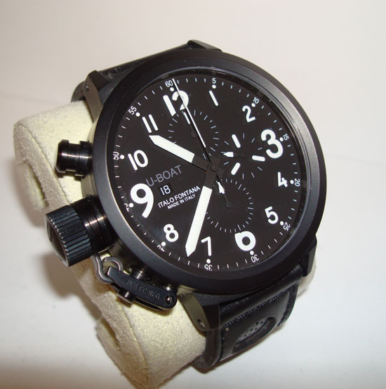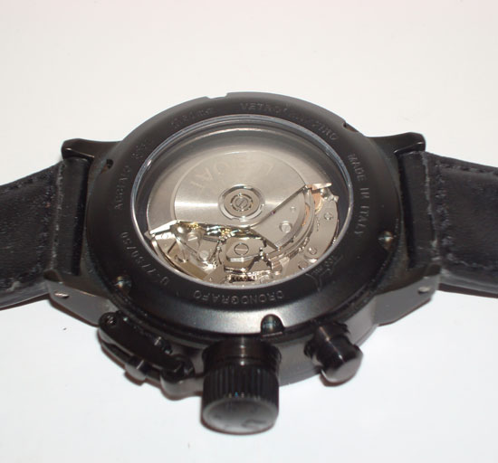 Description :steel with PVD treated, antiglare sapphire crystal, black dial with arabic numerals, automatic movement, chronograph, two indicators on the dial, date, luminiscence in handles and dial, crown protector screw, crown and push buttons on the left, water resistant 100 meters, diameter 50 mm, transparent caseback, black leather strap, steel buckle closure, size eta 6497-7750.