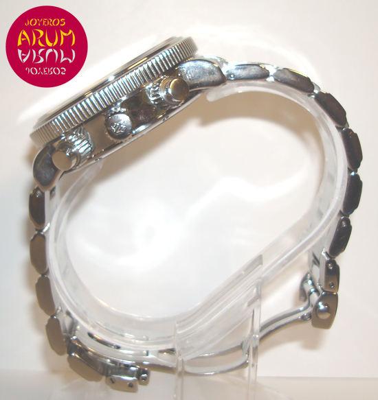 Description :steel, black dial, arabic numbers, sapphire crystal, automatic movement, annual calendar, chronograph, date at twelve, month between four and five, minutes and hours at six and nine, handcuffs and numbers luminescent, tachymeter scale, screw crown and two buttons, diameter 40 mm, waterproof 100 meters, steel strap, hidden folding clasp, year 2003.
