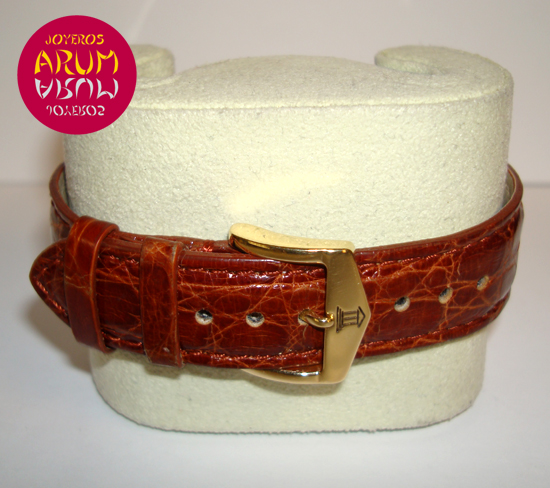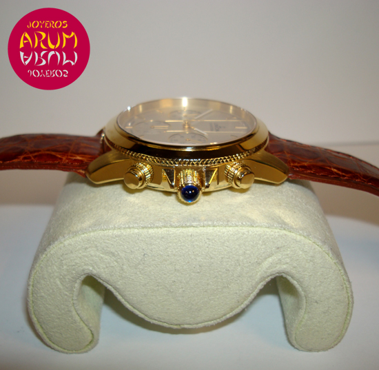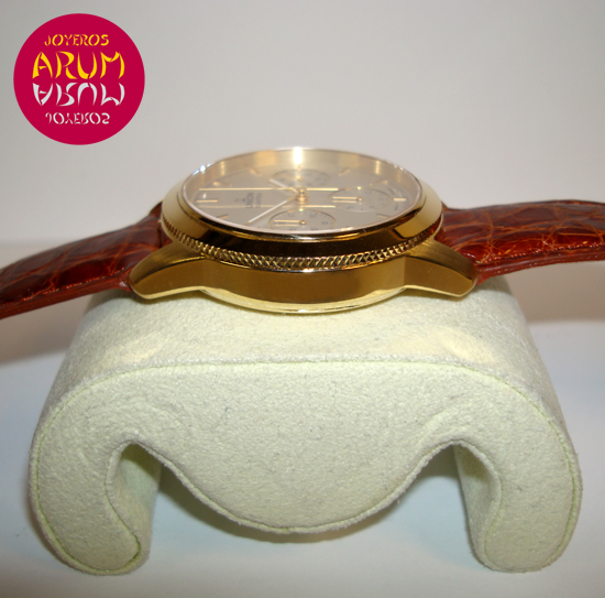 Description :yellow gold, sapphire crystal, automatic movement, chronograph, three indicators on the dial, seconds, minutes and hours, handles with luminescent indicators, crown decorated with cabochon shaped stone and two buttons, diameter 38 mm, transparent caseback, brown leather strap, buckle closure.