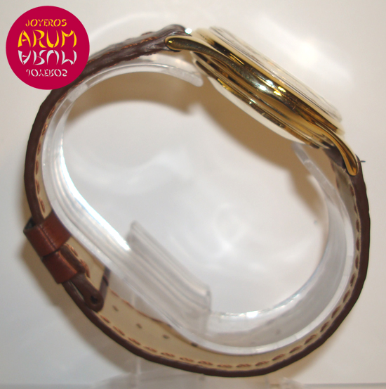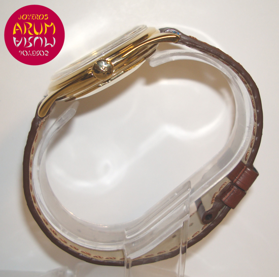 Description :yellow gold, silver dial, smooth bezel, plastic glass, automatic movement, central seconds, crown at right, diameter 35 mm, brown leather strap, buckle closure.