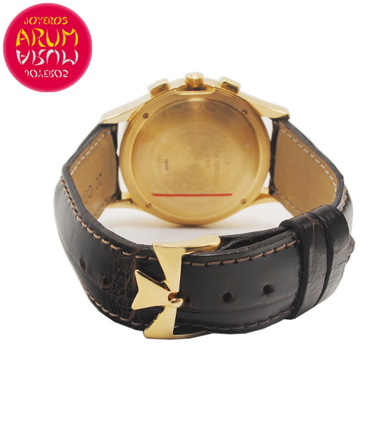 Other specifications :porcelain dial, chronograph, date and small seconds at six, 18K gold buckle. Year 1997.