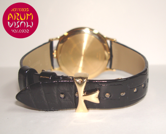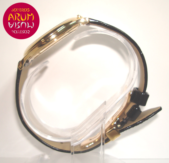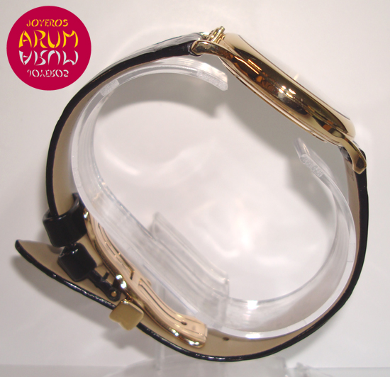 Description :yellow gold, silver dial, sapphire crystal, mechanical movement, small seconds at three, crown at twelve, diameter 34 mm, black leather strap, folding clasp, year 1999.