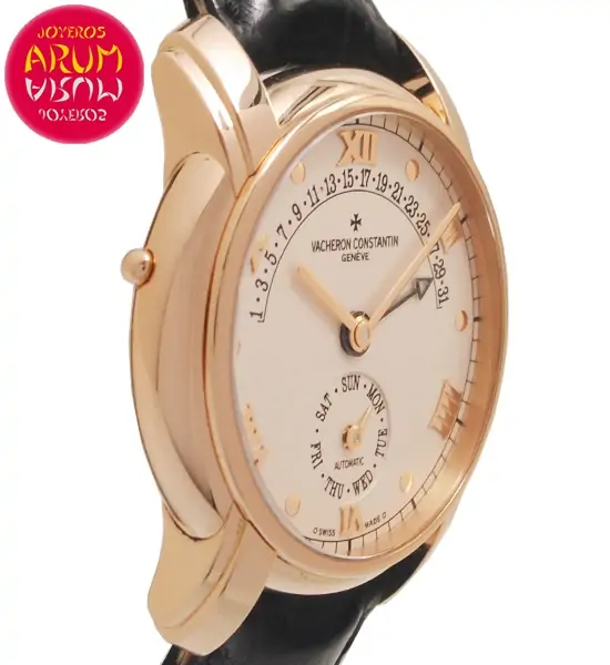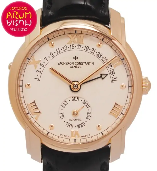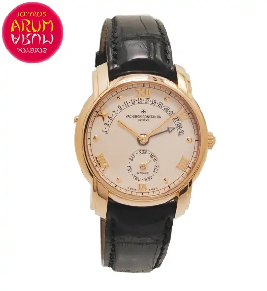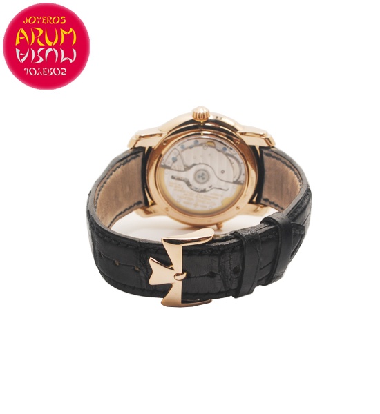 Otras especificaciones :reserva de marcha de 38 horas, esfera guilloseada, fecha retrograda, dia de la semana a las seis, tapa trasera transparente, hebilla de oro de 18K, correa y hebilla originales Vacheron Constantin.