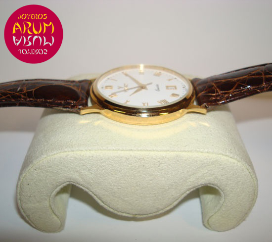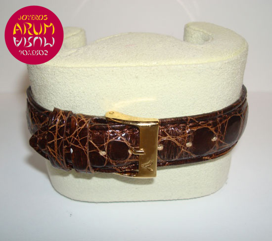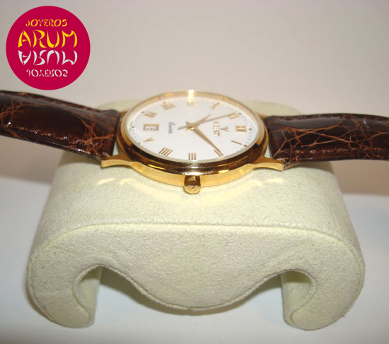 Description :yellow gold, white dial with roman numbers, sapphire crystal, quartz movement, central second, date at six, screw crown, brown leather strap, buckle closure.