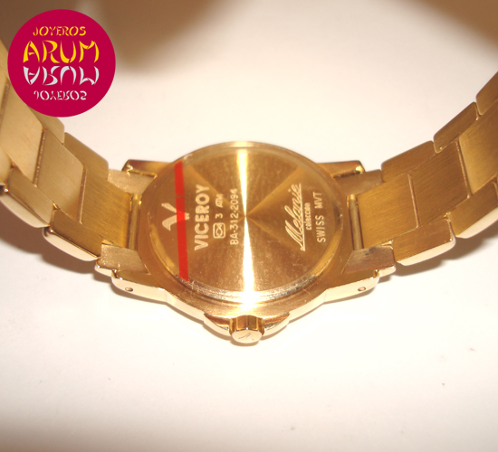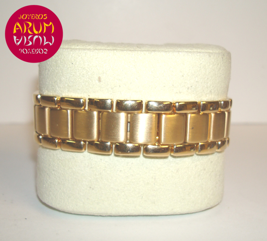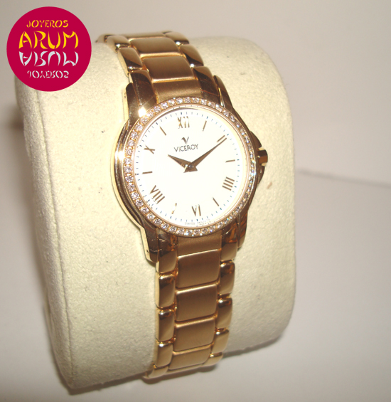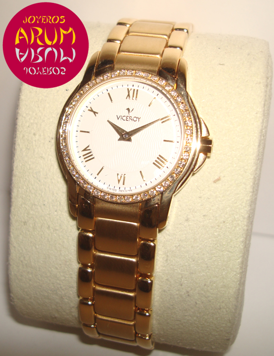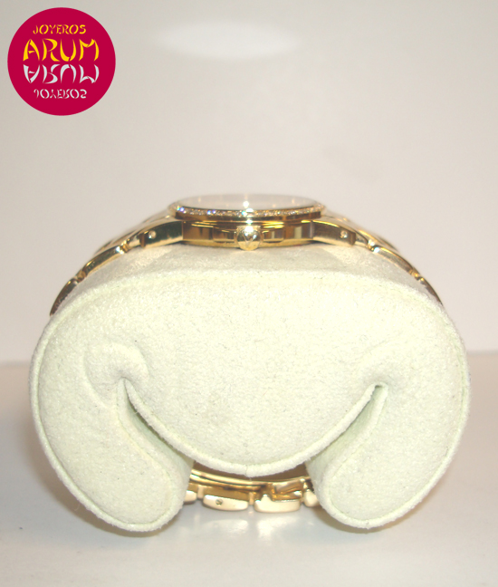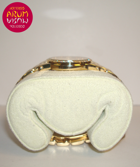 Description :ladies watch, yellow gold, white dial with roman numbers, sapphire crystal, diamonds on the bezel, crown at right, diameter 27 mm, waterproof 30 meters, yellow gold strap, hidden folding clasp.