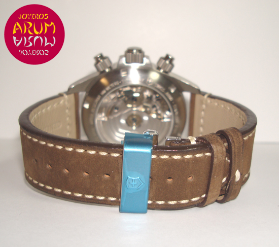 Description :limited to 120 pieces, steel, black dial, sapphire crystal, automatic movement, power reserve of 42 hours, chronograph, three indicators on the dial, minutes at twelve, hours at six, small seconds at nine, date between four and five, luminescence, tachymeter, screw crown and two pushers, transparent caseback, diameter 42 mm, waterproof 100 meters, leather strap, folding clasp.