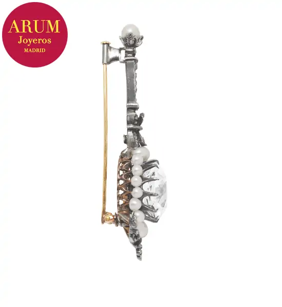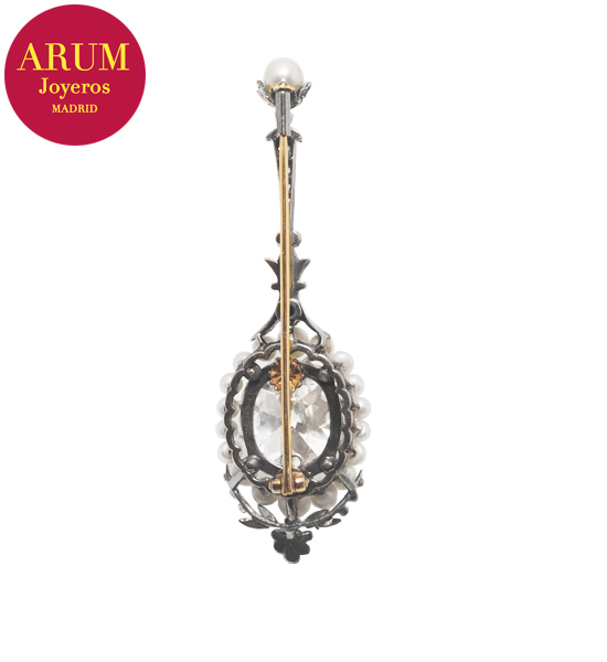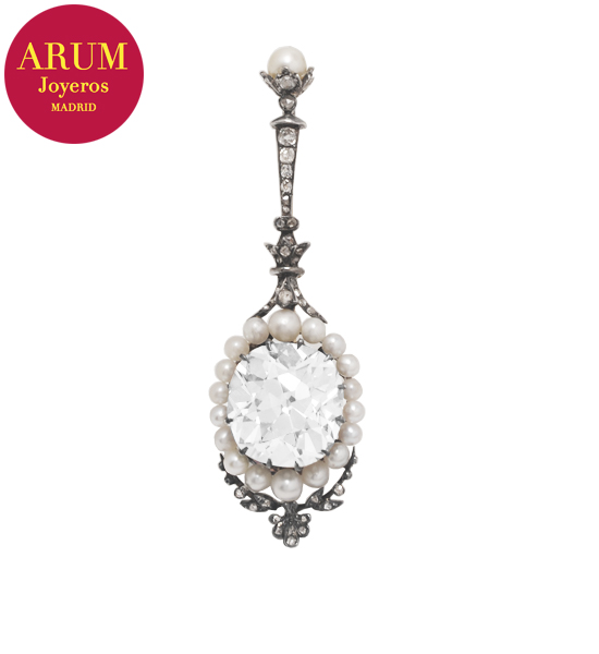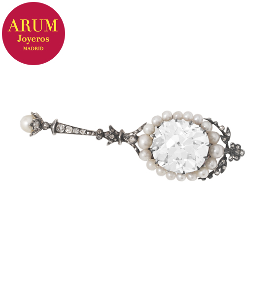 Description: Brooch made in 1890 in Paris in white and yellow metal with twenty pearls, thirty-six colourless stones and a central natural rectangular cut “old mine” diamond weighing 24.24 cts, measuring 18.36 by 17.19 by 11.55 mm, colour M, Purity VS2. The total weight of the jewel is 22.45 grams and it measures about 8.5 cm long.