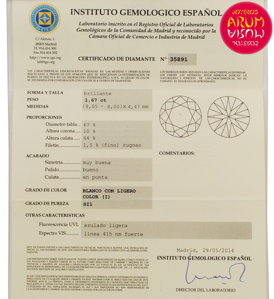 Description: White Gold 18K Ring (3,33 grs.) with Diamond 1.67 cts. (I-SI1) and two Baguettes 0.182 ct (H-VS1).