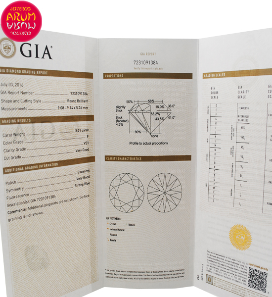 Description: White Gold 18K Ring (4,02 grs.) with Diamond 3.01 cts. (F-VS1) and two Baguettes 0.19 ct (H-VS1).