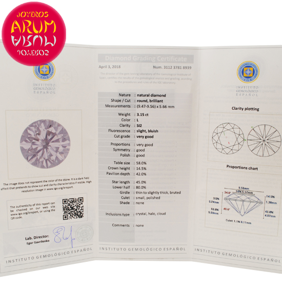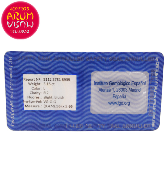 Description: White Gold 18K Ring (4,3 grs.) with Diamond 3.15 cts. (D-VS1) and two Baguettes 0.20 ct (H-VS1).